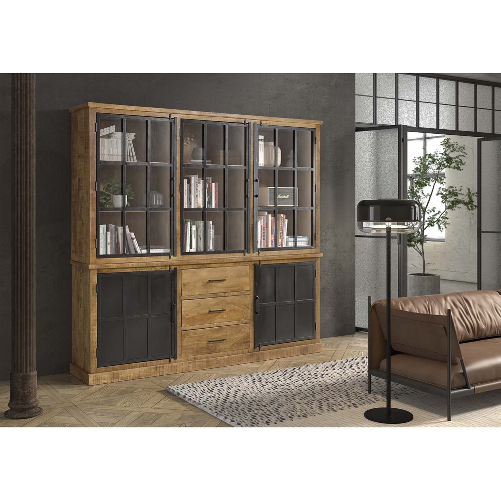 Deze tweedelige vitrinekast van 220 cm breed combineert stijl en functionaliteit in een industrieel design. Met zijn strakke zwarte metalen frame en glazen deuren biedt deze kast een elegante manier om je mooiste decoratie, servies of boeken tentoon te stellen.