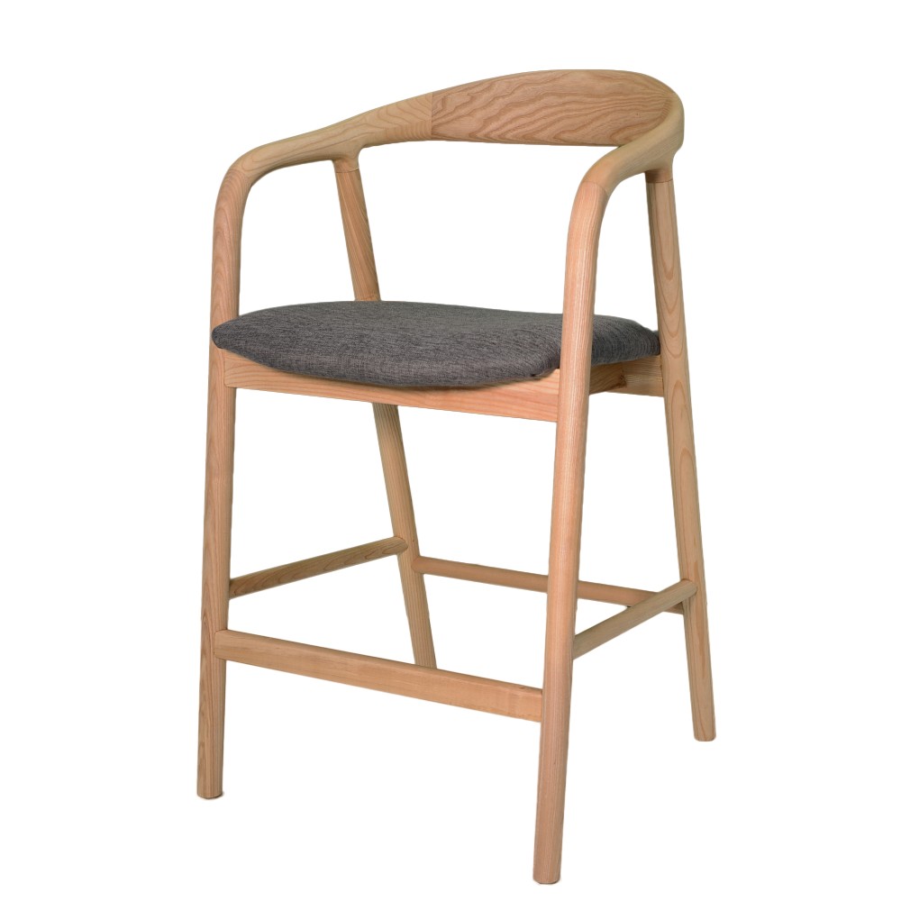 Trendy barstoel in massief hout met zitkussen in grijze stof.