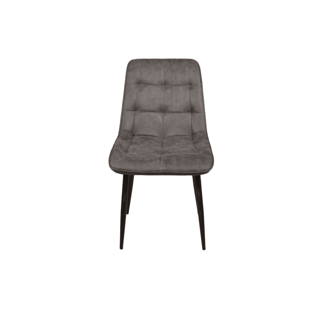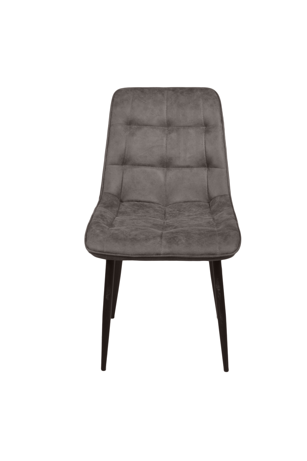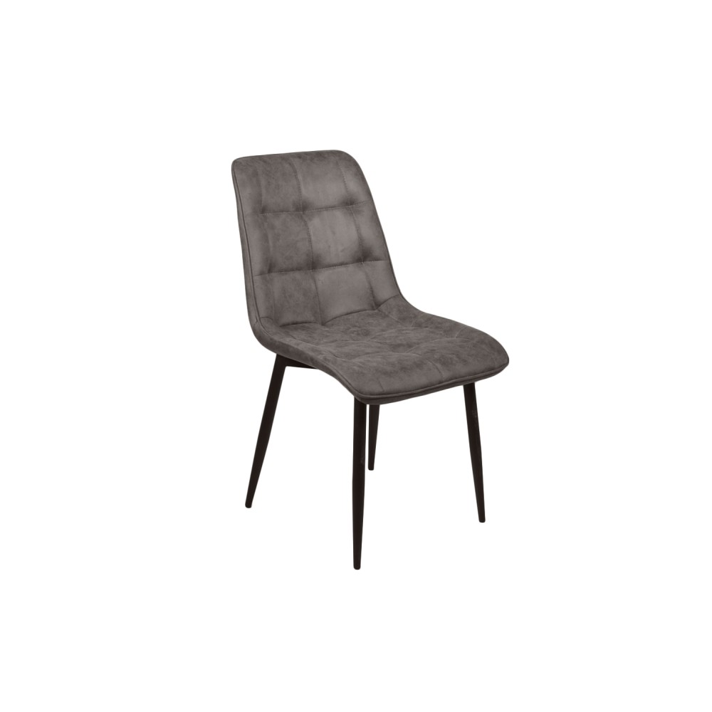 Moderne eetkamerstoel in grijze stof en met een metalen onderstel. Het patchwork geeft een speelse touch aan deze comfortabele stoel.