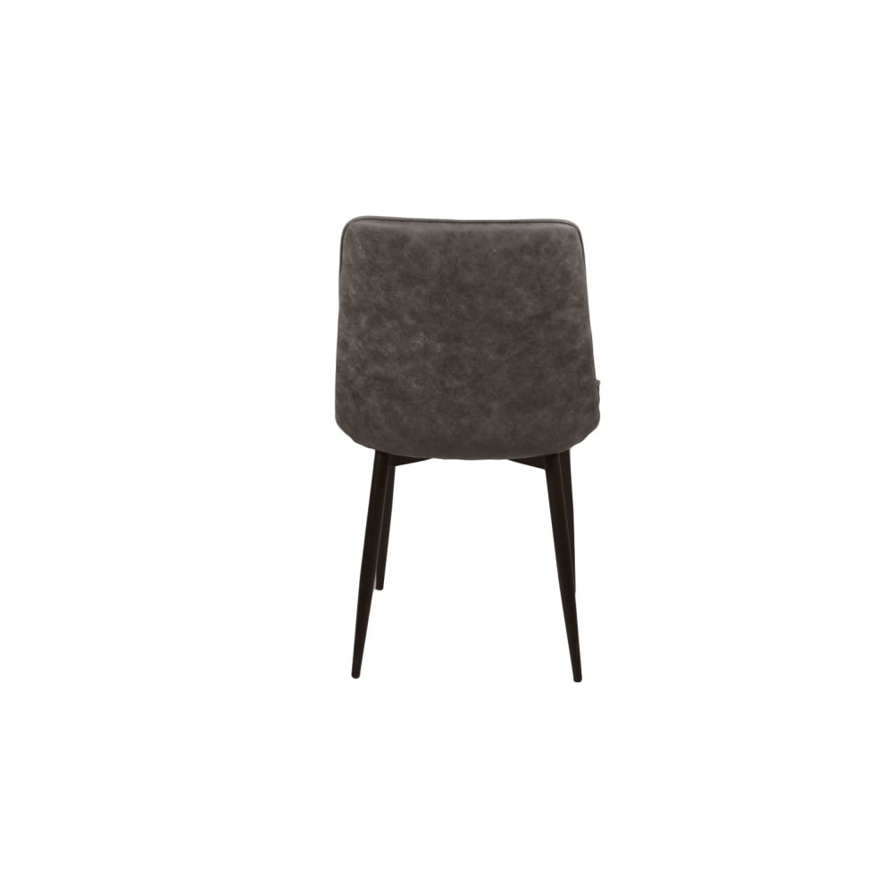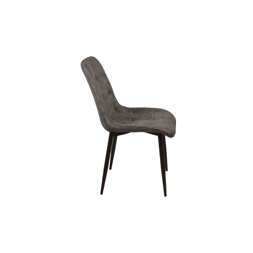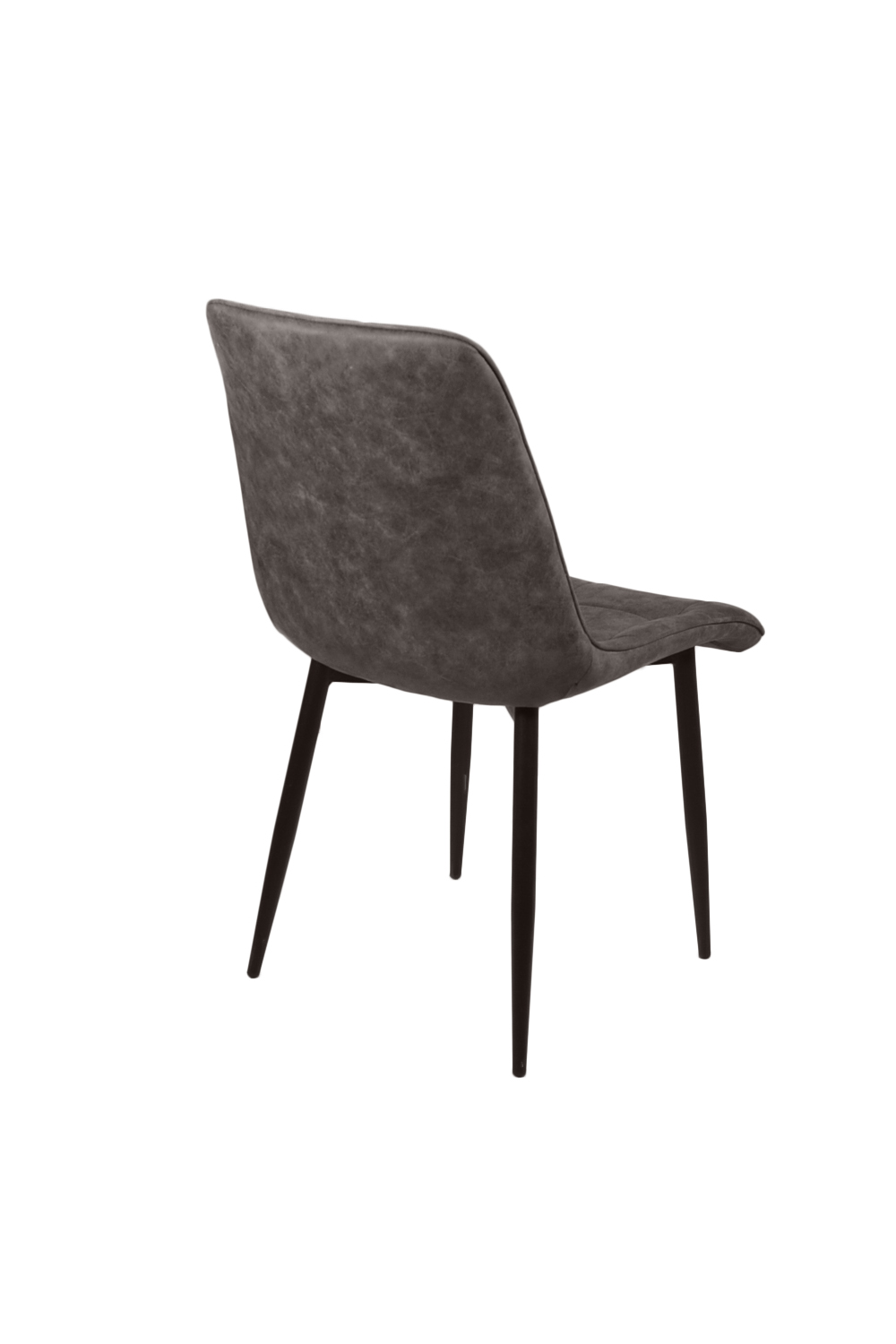 Moderne eetkamerstoel in grijze stof en met een metalen onderstel. Het patchwork geeft een speelse touch aan deze comfortabele stoel.