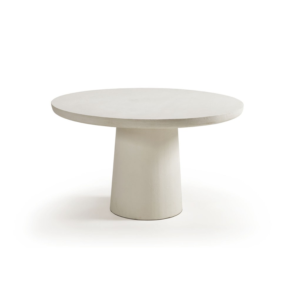 Ronde eettafel in witte kalkmortel met centrale poot.Kalkmortel wordt al duizenden jaren gebruikt al..