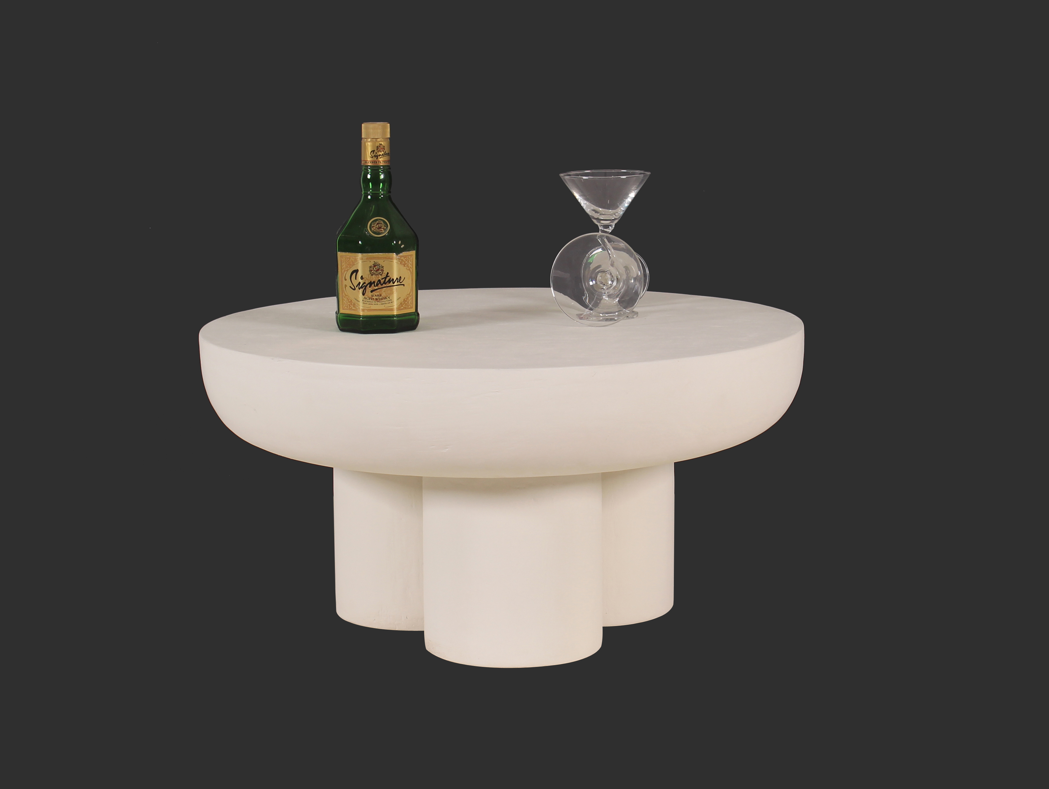 Ronde salontafel in kalkmortel met voet in de vorm van een klaverblad.