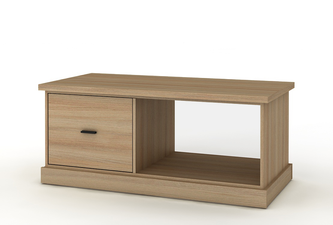 Deze rustieke salontafel in een folie van eik past in elk eigentijds interieur. Voorzien van één lade.