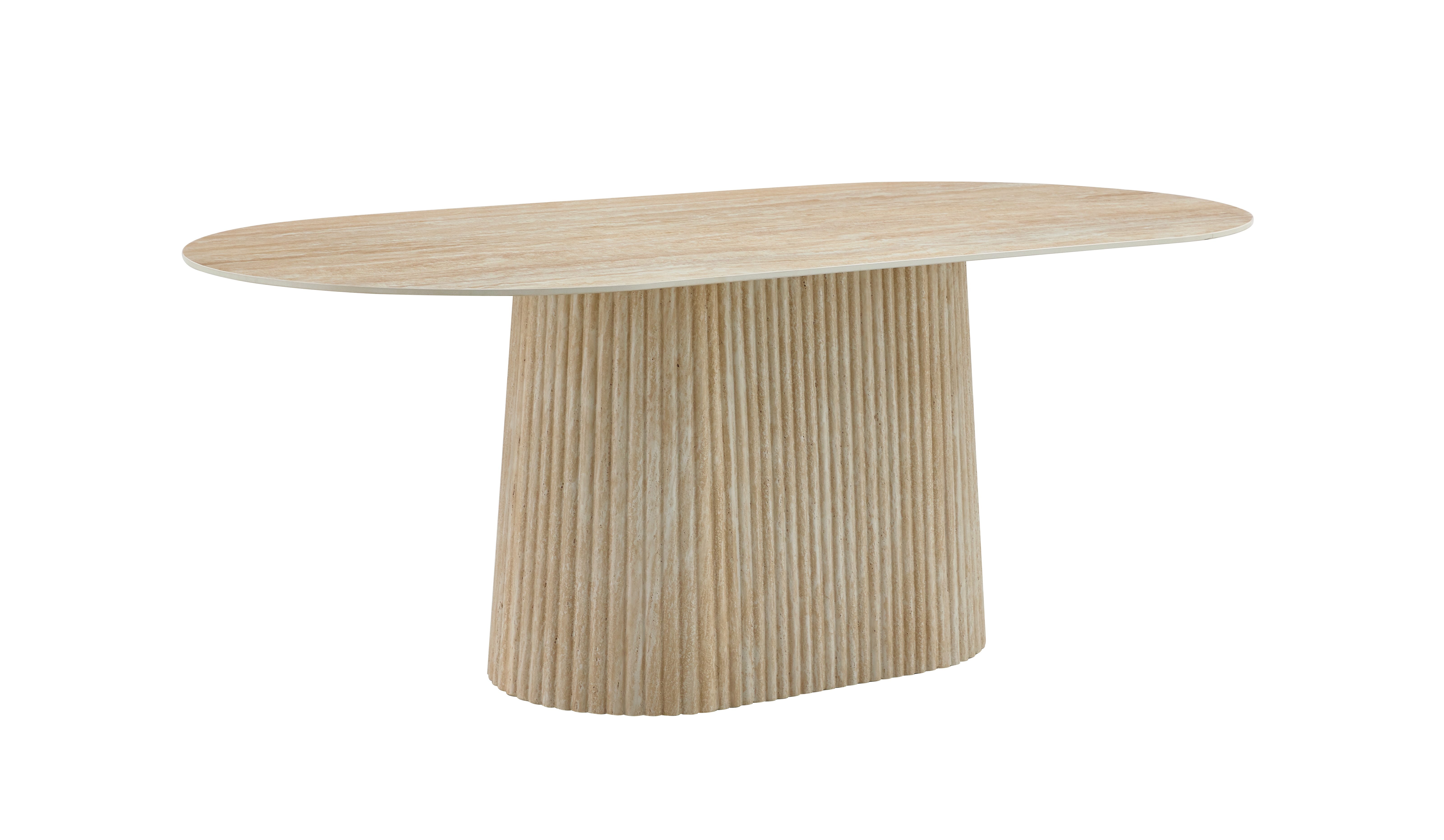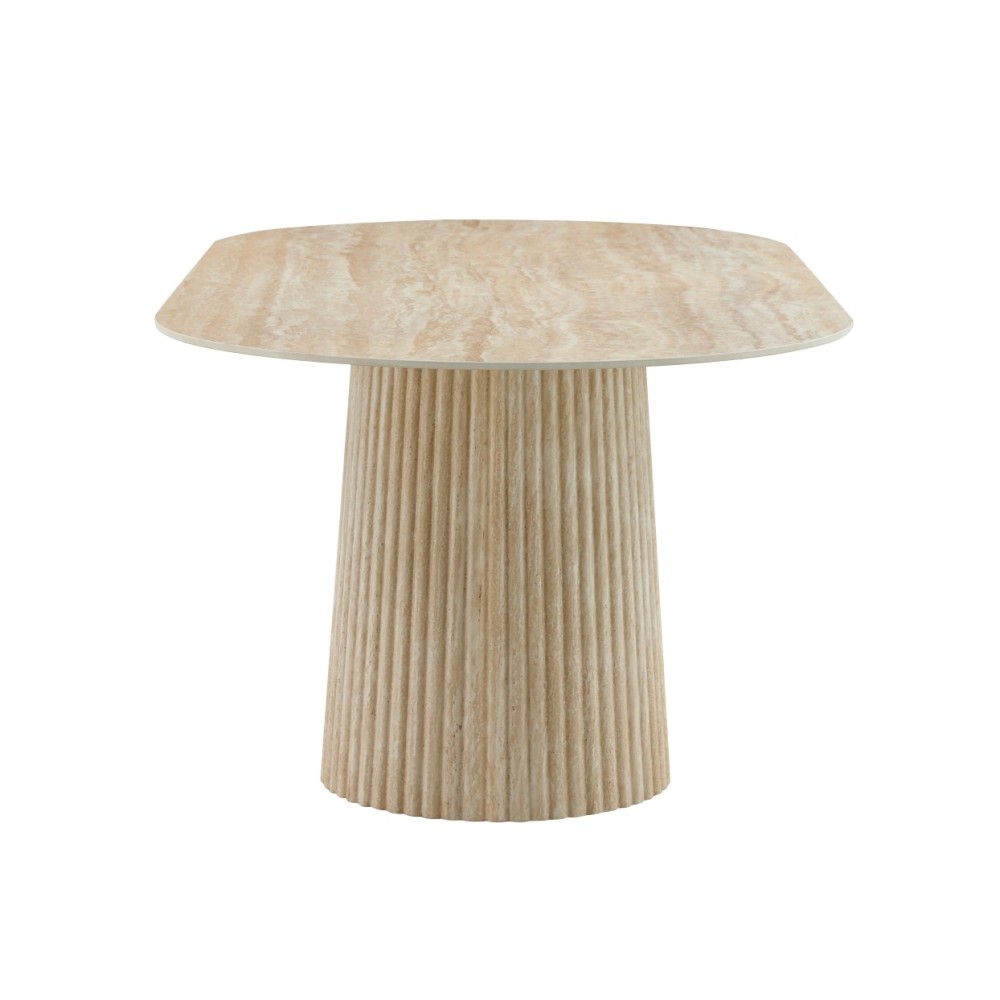 Stenen ovale tafel met centrale poot in een travertin kleur.
